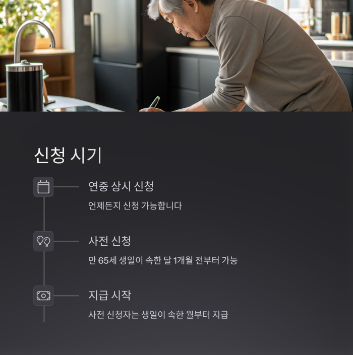 사전 신청자는 생일이 속한 월부터 기초연금을 지급받게 되므로, 늦지 않게 신청하는 것이 유리합니다.