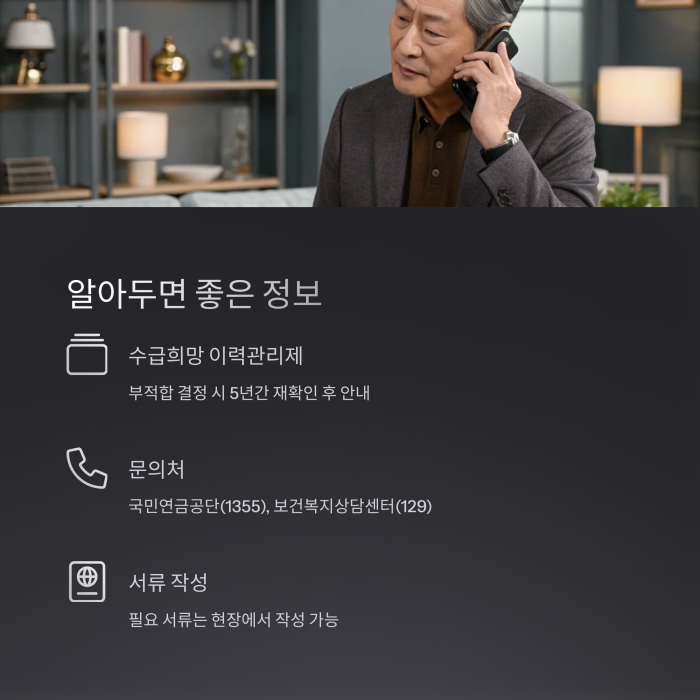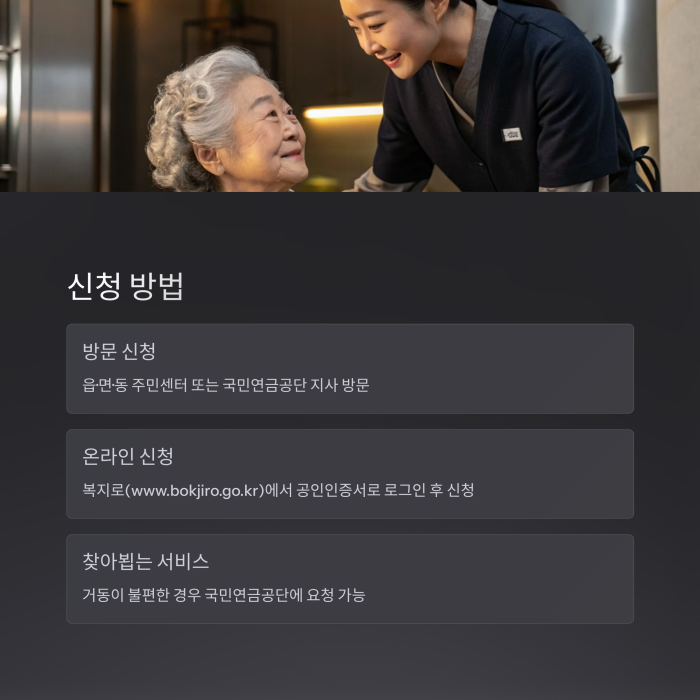 - 방문 신청: 전국 읍·면·동 주민센터 또는 국민연금공단 지사에서 접수 가능합니다. 국민연금공단 지사는 주소지 무관하게 전국 어디서나 신청할 수 있습니다.