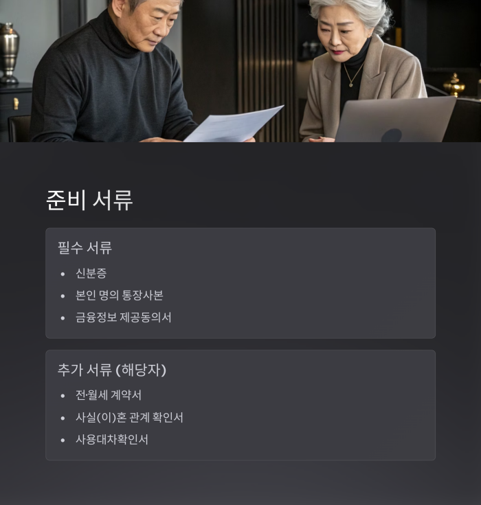 | 필수서류 | 신분증, 본인 명의 통장 사본, 사회보장급여 신청서, 소득·재산 신고서, 금융정보 제공동의서 |