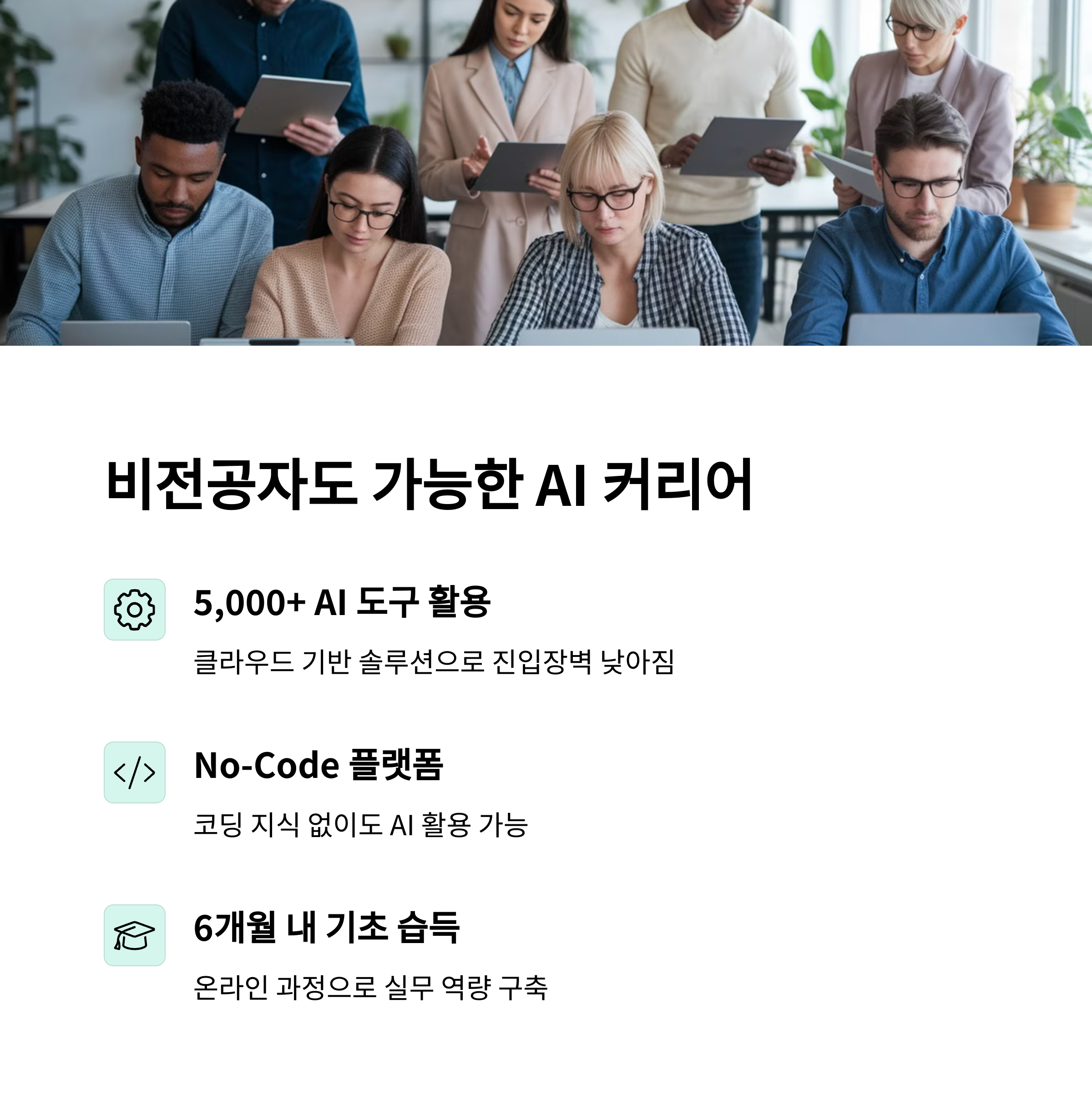최근에는 비전공자도 AI 분야에서 활약할 수 있는 환경이 마련되고 있습니다. 실제로 마케팅, 인사, 고객관리 직무에서도 AI 도구를 통해 업무 효율성을 극대화하고 있죠. 이는 단순 기술 숙련도를 넘어서 ‘AI와 함께 일할 줄 아는 능력’이 핵심 경쟁력임을 보여줍니다. 변화하는 시대에 맞춰 커리어를 재정의하고, 자신만의 방향성을 세우는 것이 중요합니다.